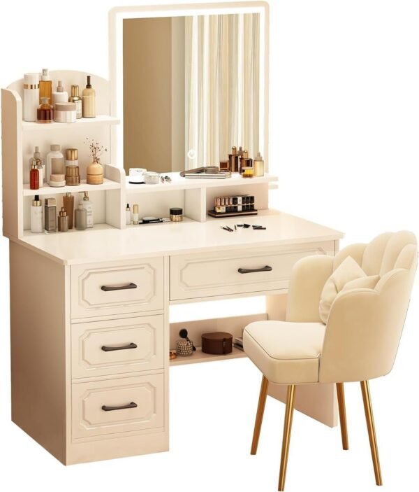 abundant storage options: say goodbye to cluttered countertops. this white makeup vanity with lighted mirror and lights offers a wealth of storage solutions, including spacious drawers and open shelves. you can neatly organize your cosmetics, jewelry, and accessories, ensuring everything has its designated place.